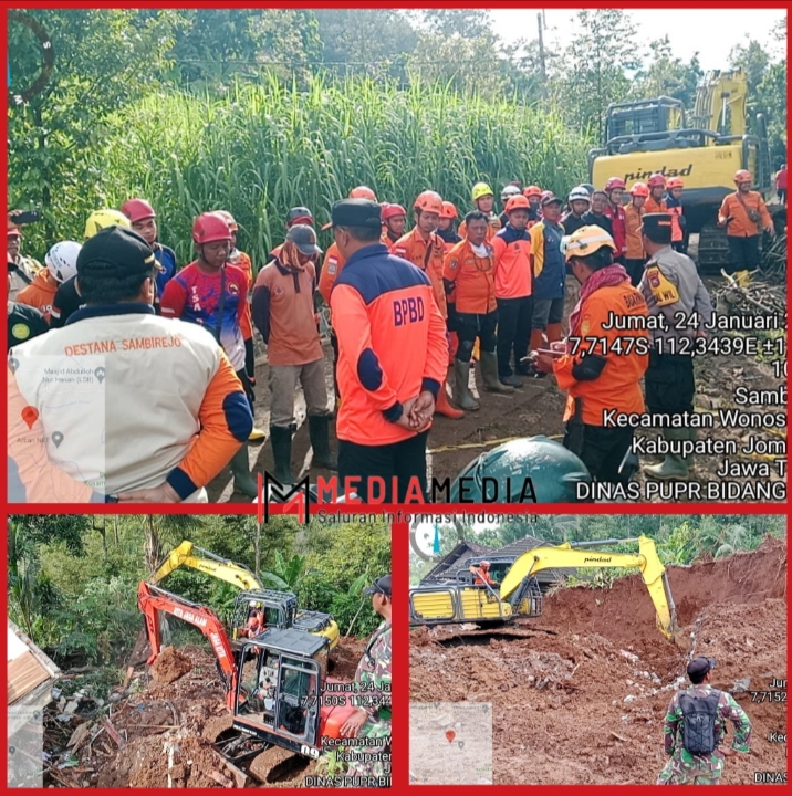 Jombang, Mediamedia.id – Dinas Pekerjaan Umum dan Penataan Ruang (PUPR) berkerja sama dengan berbagai instansi, seperti : BPBD, Polri, TNI, BASARNAS, Dinas PUPR, PMI, Dinas Sosial, Dishub, Satpol PP, aparat kecamatan, desa, dan warga setempat. Bergerak cepat melakukan upaya penyelamatan dan evakuasi korban bencana tanah longsor yang melanda Desa Sambirejo Kecamatan Wonosalam Kabupaten Jombang. Pada Kamis (23/01/2025)