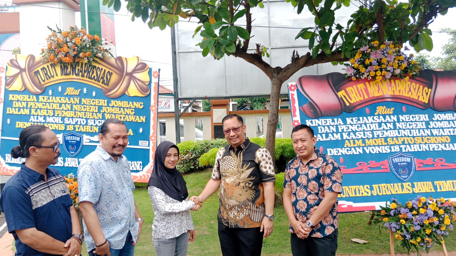 Jombang, Mediamedia.id – Pasca putusan vonis hukuman 18 tahun penjara bagi Moh Hasan Syafi’i pembunuh wartawan online Moh. Sapto Sugiono, para pewarta yang tergabung dalam Komunitas Jurnalis Jawa Timur (KJJT) Wilayah Jombang langsung merespon dengan aksi solidaritas. Para jurnalis KJJT lantas menggelar aksi simpatik dengan mengirimkan dua karangan bunga bertuliskan “Turut Mengapresiasi Atas Kinerja Kejari dan PN Jombang Dalam Kasus Pembunuhan Wartawan Alm Moh Sapto Sugiono Dengan Vonis 18 Tahun Penjara”.