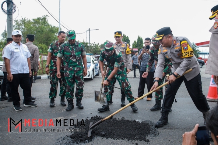 Sinergitas Polres Jombang dan Kodim 0814, Gercep menambal Jalan Berlubang di Jalan Raya Mojoagung, Jombang