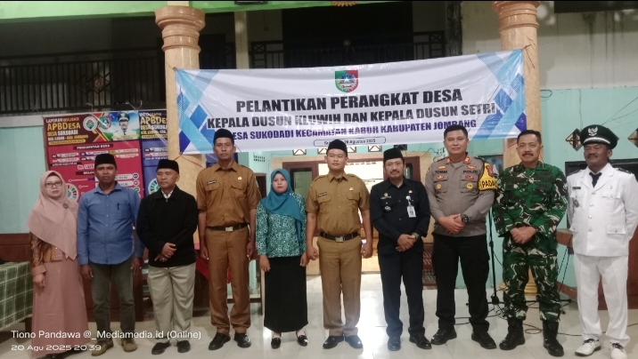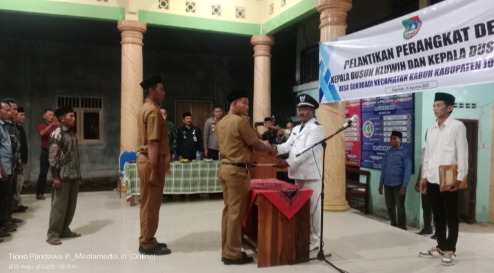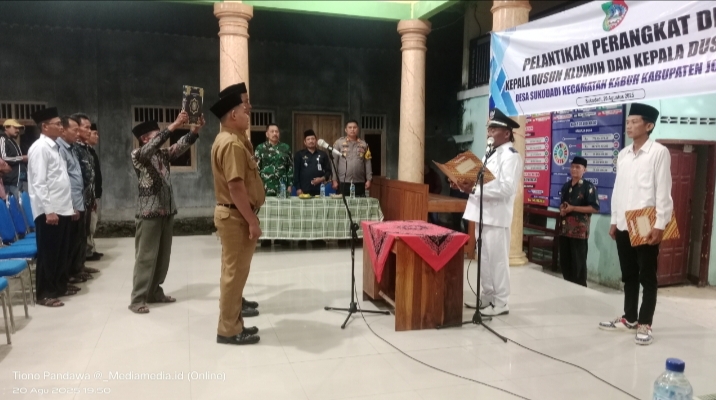 Jombang, Mediamedia.id – Suasana hangat dan penuh kekeluargaan menyelimuti Balai Desa Sukodadi Kecamatan Kabuh Kabupaten Jombang, saat di gelarnya prosesi pelantikan dan pengambilan sumpah jabatan Dua (2) Perangkat Desa , yakni Bambang Mulyono sebagai Kepala Dusun Kluwih dan Bagus Cahyono sebagai Kepala Dusun Setri. Rabu malam (20/8/2025)
