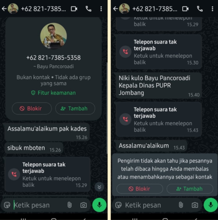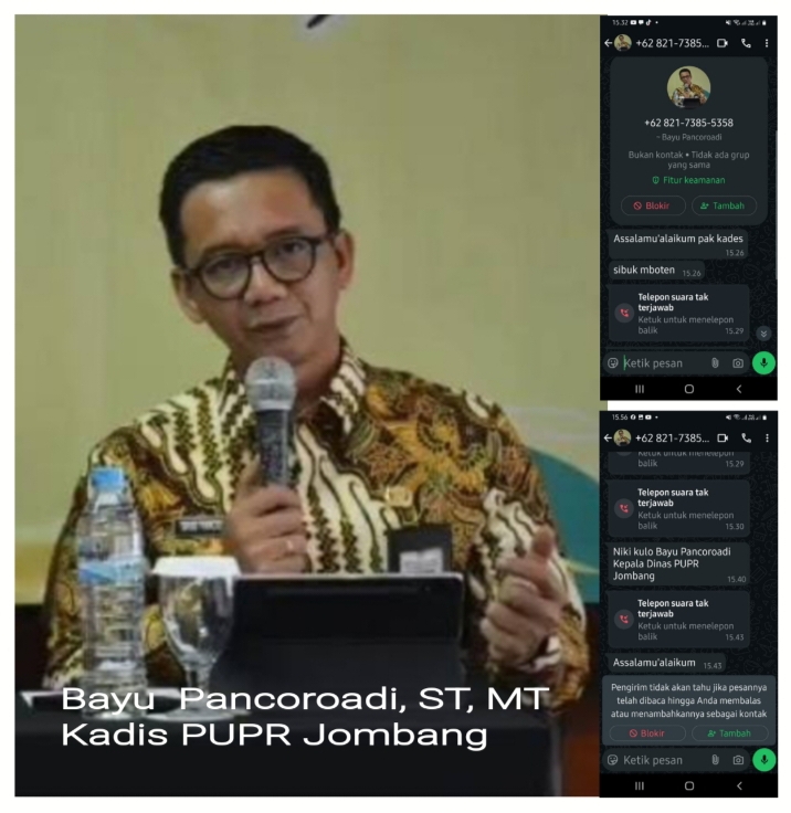 Nomor WhatsApp (WA) palsu tersebut menggunakan foto profil Kepala Dinas PUPR Kabupaten Jombang Bayu Pancoroadi.
