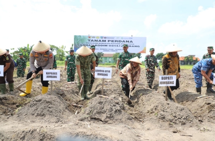 Bupati Jombang, Warsubi S.H., M.Si, Wakil Bupati Jombang Gus Salmanudin, S.Ag., M.Pd., bersama Dandim 0814 Jombang, Letkol Kav Dicky Prasojo, SH., M.Han., dan segenap Forkopimda Kabupaten Jombang, Budi Suparmin Komisaris PT Sinergi Gula Nusantara (SGN), General Manager PG Tjoekir, petani melakukan peluncuran (launching) penanaman tebu perdana di lahan milik Kodim 0814 yang berlokasi di wilayah Koramil Diwek. Sabtu, (3/1/2026)
